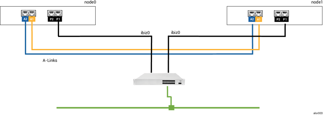 In this SplitSite example, the everRun system includes node0 and node1, but does not include a quorum server. Operation is normal; no faults are currently detected. The two nodes communicate their state and availability over the A-Link connections, as they do during normal (faultess) operation. The following illustration shows normal connections.