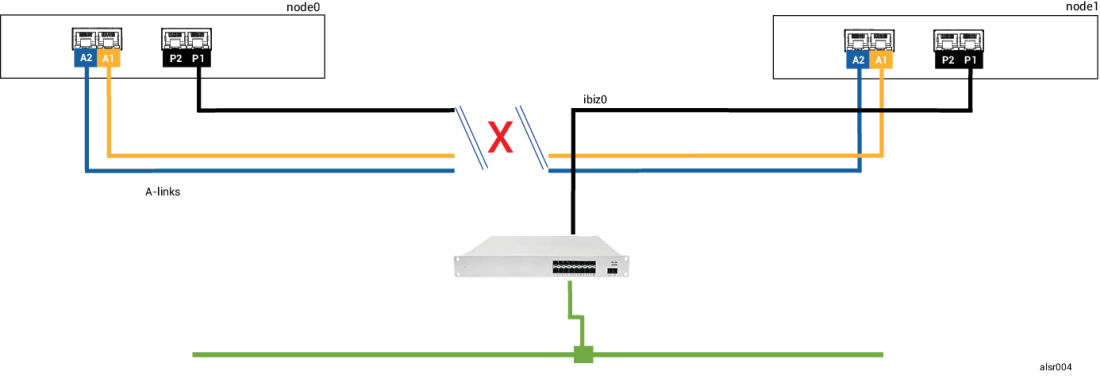 A careless fork-truck operator crashes through the wall, severing all of the network connections (both business and A-Links), while leaving the power available and the system running. The following illustration shows the fault condition.