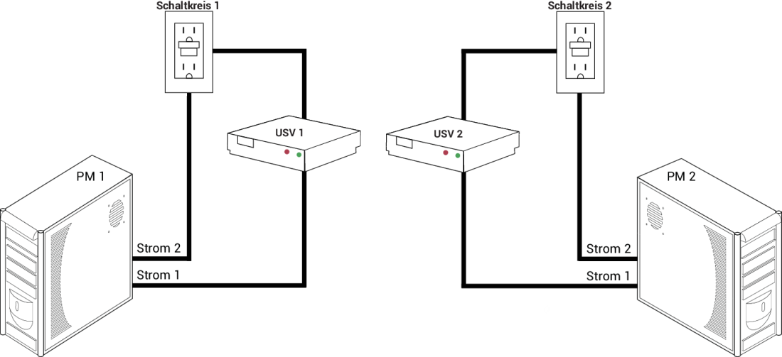 Hinweis: Stratus empfiehlt die Verwendung von zwei USV-Einheiten, die an separate und unabhängige Stromquellen angeschlossen sind. Bei Verwendung von zwei Stromquellen wird das System auch dann mit Strom versorgt, wenn eine der Einheiten ausfällt.